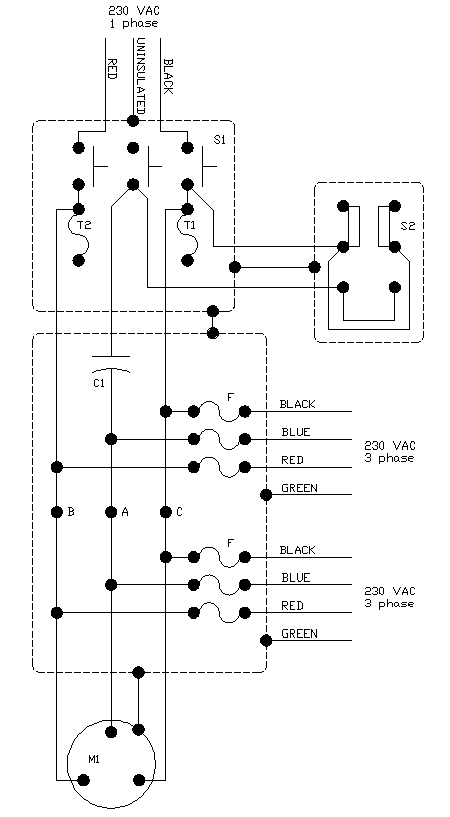 No matter how old the mill, the original motor is very likely OK - three phase motors seem to run forever. However, unless you live in an industrial park, you probably won't have three phase available. An obvious mechanical option is to replace the three phase motor with a single phase one. Alternatively there are many electrical options, not all of which involve expensive boxes of mystery electronics. One is to make ersatz three phase with a rotary converter. I tried this, and it seems to be working pretty well. Made In USA-type houses like mine have 230 volt single phase service - that is, two live legs with 230 volts between them, and a common at ground potential. Either of these 230 volt lines and common powers the normal household 115 volt circuits. (It's sometimes useful to think of household service as 115 volt 2-phase, with the two phases at 180 degrees.) From this 230 volt single phase power, we can generate a reasonable sort of 3-phase with the help of an idler motor. Try these sites (all links good as of Dec. 2003) - Building a Phase Converter Phase Converters and Starting Circuits Phase Converters Building an Auto-Start Rotary Three Phase Converter Home Made 3 Phase Self Starting Phase Converter 3 Phase Rotary Convertor Useful information (no title) And these commercial sites - Phase Converter Standards Build your own rotary phase converter! Below is the circuit I wired up. The starting procedure is important. First the capacitor switch S2 is switched on, then the motor starter switch S1 is switched on. S2 is switched off as soon as the idler gets up to speed (much less than a second). Shutdown procedure is simple - just turn off S1. ![]() This is an old item I salvaged. It was attached to the mill when I acquired it, although not enough wires were still hooked up for me to be able to tell what it was doing there. In any case, it's basically a 3PST switch with relay heater elements in series with two of the poles. My circuit uses only two of the three switch poles. I'm using the center pole only as a convenient terminal, not as a switch. T1, T2 - relay heater elements. These are the "thermal overloads". They open the circuit if the motors draw too much current, for whatever reason. The heating business is just a way to provide a time delay so they aren't tripped immediately by the motor's starting current. The ones which happened to be in the switch already are sized for a full-load motor current of 3.01 amps, just right for the mill's 2.9 amp motor. However, they are not big enough for my idler motor, which will trip them in about a minute even though it's just idling. So, I'm not using the overloads. Ideally I'd get a pair with higher ratings. S2 - DPDT toggle switch. This switches the starting capacitor into the circuit. The switch is rated at ten amps, but as I expect the starting capacitor to draw more than that, I wired up the two poles in parallel. So my circuit uses it as a 20 amp SPST switch. A high-current momentary pushbutton switch would be better. C1 - 130-156 uf, 250 V motor start capacitor. This provides a phase shift in the current to one of the motor connections, which is all we need to start rotation. It doesn't matter which direction the idler motor rotates. 130-156 microfarads (a strange way to specify it - usually one would expect to see 143 +/- 10%, which is actually pretty good precision for a cheapo capacitor - but that's how it's marked) seems to be just right for the 2 hp idler, bringing it up to speed in less than a second without dimming all the lights in the house. Get one for about $5.00 from McMaster-Carr (stock number 7245K39). F - 7 amp slow-blow fuses. These are glass 3AG type 1 1/4" x 1/4" fuses, easily obtained at Radio Shack and hardware stores. Fusing two lines would be enough in normal operation, but I fused all three to guard against damage on startup in case of wiring errors. There are two sets of three fuses, as I left provision for another 3-phase line should I want one in future. M1 - idler motor, Dayton 2 hp TEFC ("totally enclosed fan cooled"), 208-230/450 volt, 6.20 full-load amps at 230 volts. This motor was new in the box, just taking up space in somebody's stockroom before they unloaded it on eBay. A new motor is nice, you don't have the annoyances you sometimes get with used motors, like somebody painting over the plate which tells you how to wire it for 230 volt operation. The motor typically costs less than the shipping costs. In the US, be prepared for a minimum of $30 to ship a motor in the 2 to 5 HP range. Insure it if it's not in its factory packaging. The motor itself tends to be very sturdy but if it's dropped on its aft end - where the fan and cover are - it can be wrecked. (Ask me how I know ... @$#%&* UPS). My wiring is 12 gauge 2 conductor plus ground or 3 conductor plus ground. The 12 gauge is actually far heavier than needed - the motor and idler don't draw anything like the 20 amps that 12 gauge can comfortably carry, even at startup. I estimate that the motor start capacitor might draw 12 amps. Well, better too heavy than too light. All the boxes, panels, cabinets, whatever are grounded, eventually, to a good earth ground at the house's main service breaker panels. This circuit isn't ideal. A magnetic contactor would be nice instead of the manual starter, as that would disconnect in case of a momentary power failure. In my circuit, if power was to be interrupted long enough for the motors to stop rotating, they wouldn't start rotating again after power was restored, as the start capacitor would be switched out. So they would sit there drawing their starting currents and would overheat within a few seconds. Maybe the fuses would come to the rescue, maybe not. Fortunately I haven't had any trouble with momentary outages around here lately, so there's no need to worry about that stuff just yet. Another improvement would be a timer relay to switch off the start capacitor after, say, a second. Then no operator coor